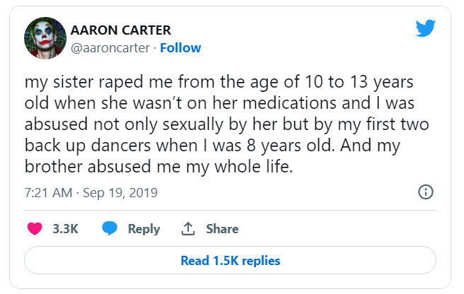 Barnartisten Aaron Carter verkade ha en hel familj som övergrep sig på honom. Han anklagade flera familjemedlemmar – både systrar och bröder – för att ha våldtagit honom. Han anklagade dem för att vara ute efter hans tillgångar och att musikindustrin försökte ha ihjäl honom.