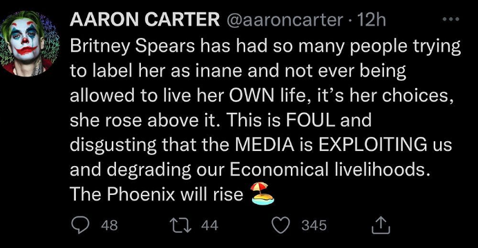 ”Britney Spears har så många människor som försöker märka henne som galen och aldrig nånsin låta henne leva sitt EGET liv, det är hennes val, hon reste sig över det. Det är FULT och vidrigt att MEDIA EXPLOATERAR oss och försämrar vårt ekonomiska levebröd. Fenixen kommer att resa sig.