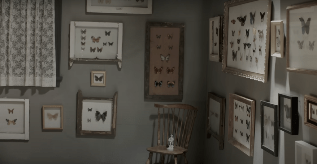 Efteråt tas paret hem till sin lägenhet igen och nu är väggarna täckta av tavlor med fjärilar.