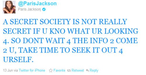 – Från Paris Jacksons Twitter angående ett hemligt sällskap som drar i trådarna.