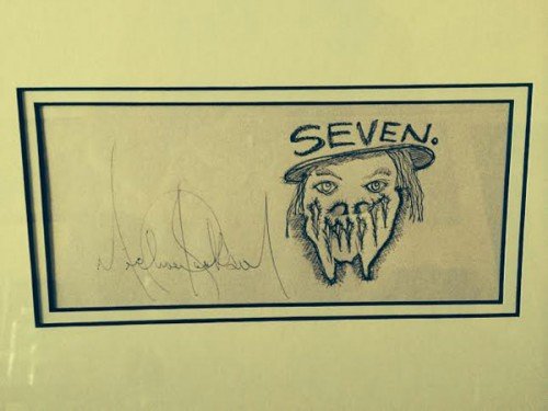 Teckning som tycks vara av Michael själv med en deformerad underkäke tillsammans med texten ”sju”.